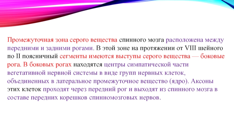 В этой зоне на протяжении от VIII шейного по II поясничный сегменты имеются выступы серого вещества — боковые рога. В боковых рогах находятся центры симпатической части вегетативной нервной системы в виде групп нервных клеток, объединенных в латеральное промежуточное вещество (ядро). Аксоны этих клеток проходят через передний рог и выходят из спинного мозга в составе передних корешков спинномозговых нервов.