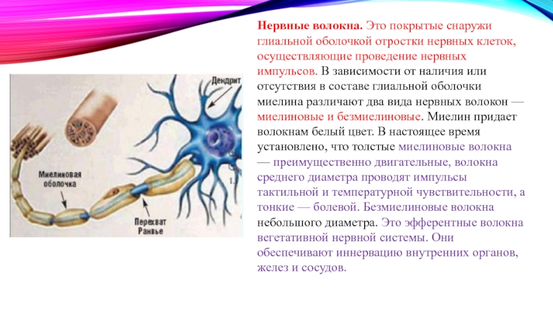 Слайд 7Нервные волокна. Это покрытые снаружи глиальной оболочкой отростки нервных клеток, осуществляющие