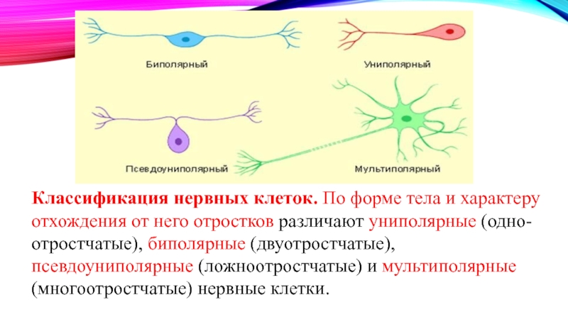 Слайд 4Классификация нервных клеток. По форме тела и характеру отхождения от него
