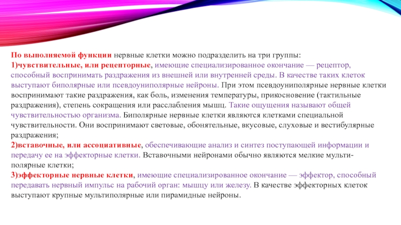 Слайд 6По выполняемой функции нервные клетки можно подразделить на три группы: