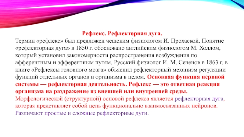 Понятие «рефлекторная дуга» в 1850 г. обосновано английским физиологом М. Холлом, который установил закономерности распространения возбуждения по афферентным и эфферентным путям. Русский физиолог И. М. Сеченов в 1863 г. в книге «Рефлексы головного мозга» объяснил рефлекторный механизм регуляции функций отдельных органов и организма в целом. Основная функция нервной системы — рефлекторная деятельность. Рефлекс — это ответная реакция организма на раздражение из внешней или внутренней среды. Морфологической (структурной) основой рефлекса является рефлекторная дуга, которая представляет собой цепь функционально взаимосвязанных нейронов. Различают простые и сложные рефлекторные дуги.