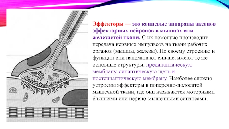 железистой ткани. С их помощью происходит передача нервных импульсов на ткани рабочих органов (мышцы, железы). По своему строению и функции они напоминают синапс, имеют те же основные структуры: пресинаптическую мембрану, синаптическую щель и постсинаптическую мембрану. Наиболее сложно устроены эффекторы в поперечно-полосатой мышечной ткани, где они называются моторными бляшками или нервно-мышечными синапсами.