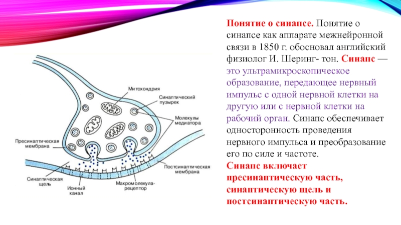 Слайд 10Понятие о синапсе. Понятие о синапсе как аппарате межнейронной связи в