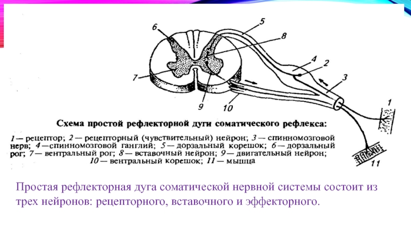 Слайд 15Простая рефлекторная дуга соматической нервной системы состоит из трех нейронов: рецепторного,