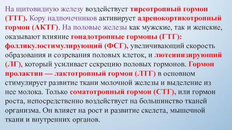 Слайд 27На щитовидную железу воздействует тиреотропный гормон (ТТГ). Кору надпочечников активирует адренокортикотропный