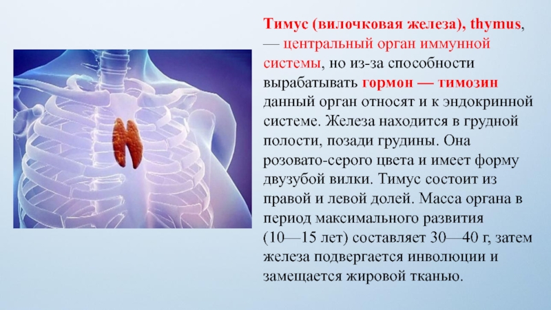 Слайд 12Тимус (вилочковая железа), thymus, — центральный орган иммунной системы, но из-за