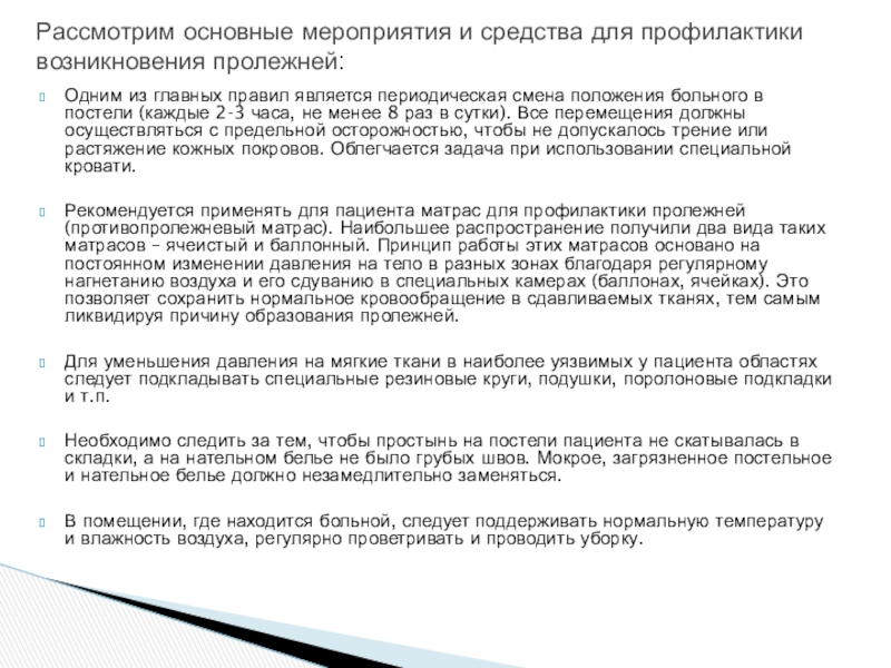 Рассмотрим основные мероприятия и средства для профилактики возникновения пролежней: