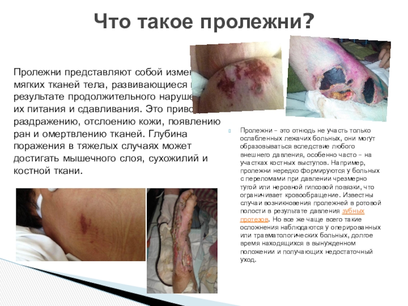 Пролежни – это отнюдь не участь только ослабленных лежачих больных, они могут образовываться вследствие любого внешнего давления, особенно часто – на участках костных выступов. Например, пролежни нередко формируются у больных с переломами при давлении чрезмерно тугой или неровной гипсовой повязки, что ограничивает кровообращение. Известны случаи возникновения пролежней в ротовой полости в результате давления зубных протезов. Но все же чаще всего такие осложнения наблюдаются у оперированных или травматологических больных, долгое время находящихся в вынужденном положении и получающих недостаточный уход.