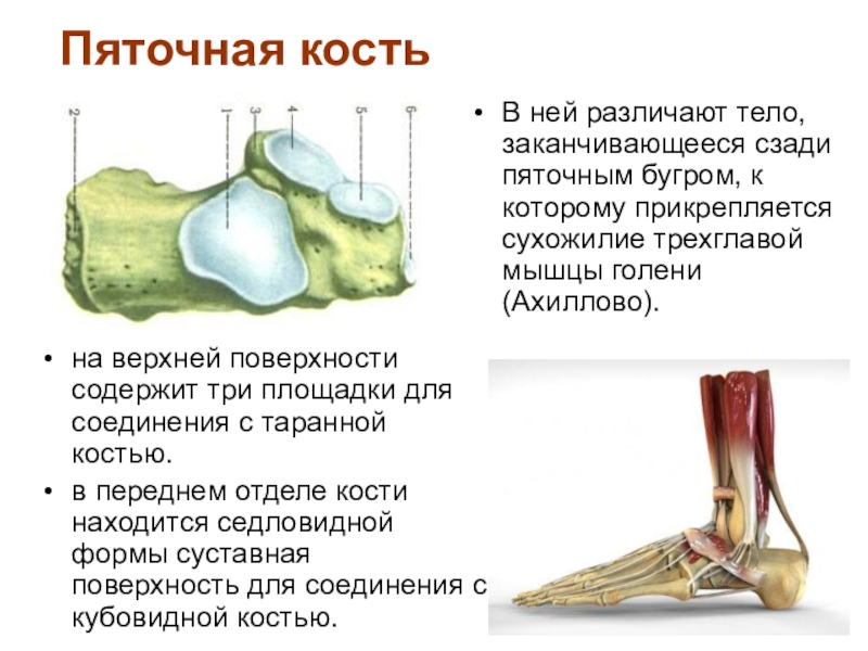 на верхней поверхности содержит три площадки для соединения с таранной костью.