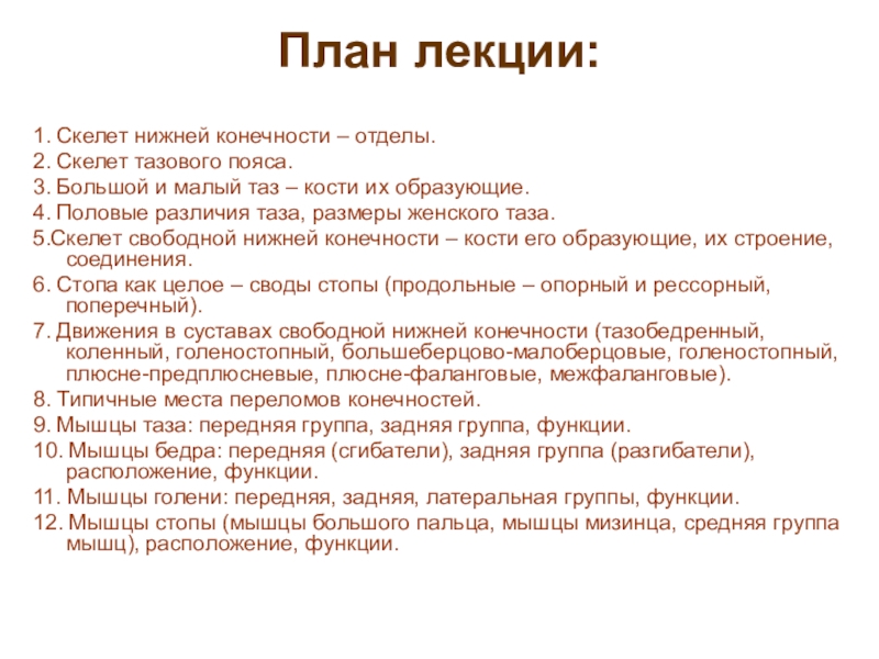 скелет тазового пояса, классификацией мышц нижней конечности; топографическими образованиями нижней конечности. Дать строение и соединения костей свободной нижней конечности. Ознакомить с движениями в суставах нижней конечности, типичными местами переломов конечностей.