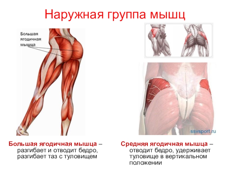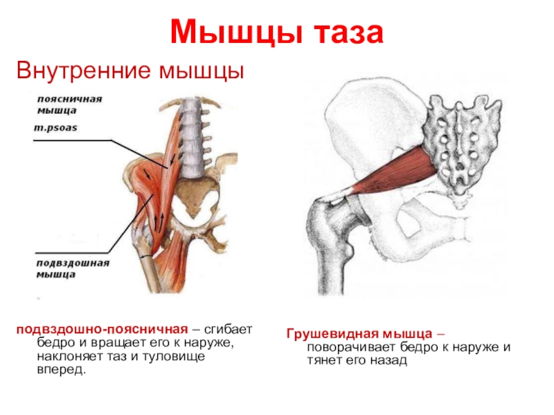 подвздошно-поясничная – сгибает бедро и вращает его к наруже, наклоняет таз и туловище вперед.
