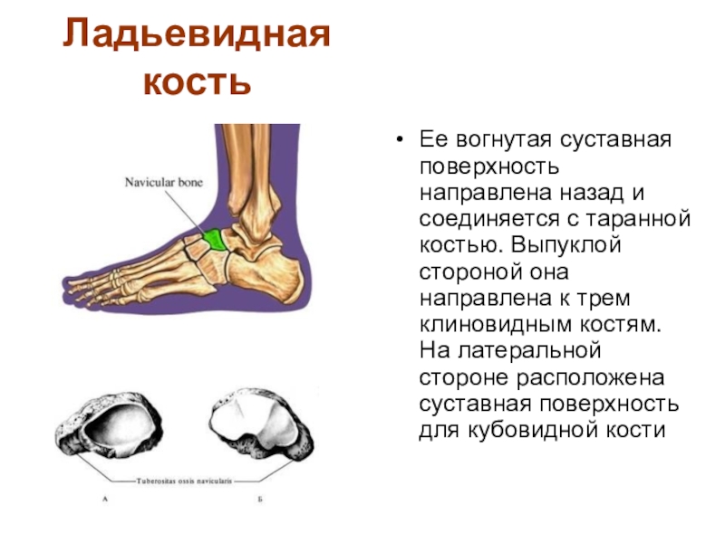 таранной костью. Выпуклой стороной она направлена к трем клиновидным костям. На латеральной стороне расположена суставная поверхность для кубовидной кости