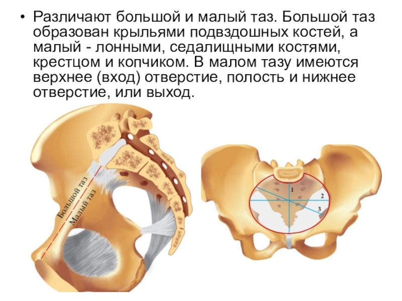 а малый - лонными, седалищными костями, крестцом и копчиком. В малом тазу имеются верхнее (вход) отверстие, полость и нижнее отверстие, или выход.