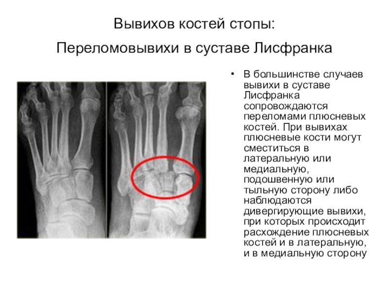 в суставе Лисфранка сопровождаются переломами плюсневых костей. При вывихах плюсневые кости могут сместиться в латеральную или медиальную, подошвенную или тыльную сторону либо наблюдаются дивергирующие вывихи, при которых происходит расхождение плюсневых костей и в латеральную, и в медиальную сторону