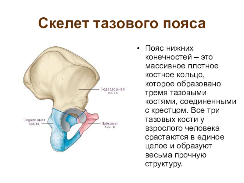 кольцо, которое образовано тремя тазовыми костями, соединенными с крестцом. Все три тазовых кости у взрослого человека срастаются в единое целое и образуют весьма прочную структуру.