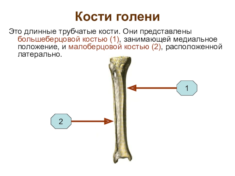 Это длинные трубчатые кости. Они представлены большеберцовой костью (1), занимающей