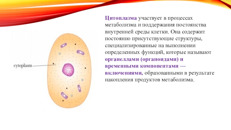 Слайд 7Цитоплазма участвует в процессах метаболизма и поддержания постоянства внутренней среды клетки.
