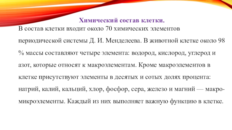 периодической системы Д. И. Менделеева. В животной клетке около 98 % массы составляют четыре элемента: водород, кислород, углерод и азот, которые относят к макроэлементам. Кроме макроэлементов в клетке присутствуют элементы в десятых и сотых долях процента: натрий, калий, кальций, хлор, фосфор, сера, железо и магний — макро-микроэлементы. Каждый из них выполняет важную функцию в клетке.