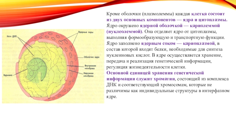 Ядро окружено ядерной оболочкой — кариолеммой (нуклеолеммой). Она отделяет ядро от цитоплазмы, выполняя формообразующую и транспортную функции. Ядро заполнено ядерным соком — кариоплазмой, в состав которой входят белки, необходимые для синтеза нуклеиновых кислот. В ядре осуществляется хранение, передача и реализация генетической информации, регуляция жизнедеятельности клетки.