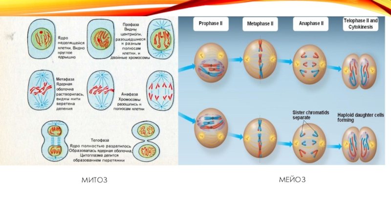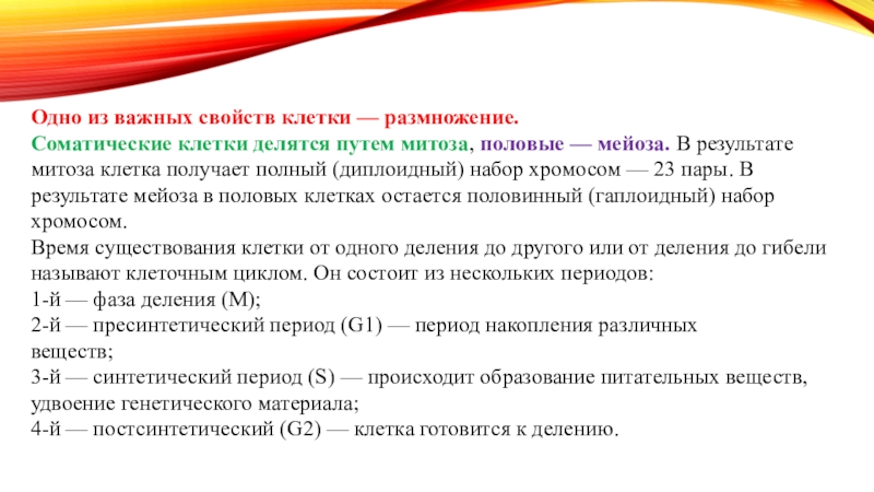 митоза, половые — мейоза. В результате митоза клетка получает полный (диплоидный) набор хромосом — 23 пары. В результате мейоза в половых клетках остается половинный (гаплоидный) набор хромосом.