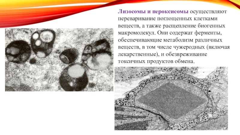 Слайд 11Лизосомы и пероксисомы осуществляют переваривание поглощенных клетками веществ, а также расщепление