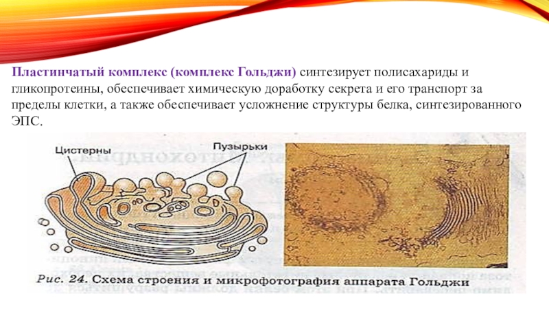 Слайд 10Пластинчатый комплекс (комплекс Гольджи) синтезирует полисахариды и гликопротеины, обеспечивает химическую доработку