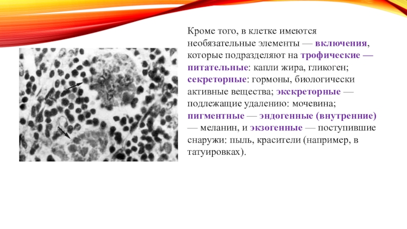 Слайд 13Кроме того, в клетке имеются необязательные элементы — включения, которые подразделяют