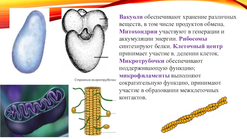 участвуют в генерации и аккумуляции энергии. Рибосомы синтезируют белки. Клеточный центр принимает участие в. делении клеток.