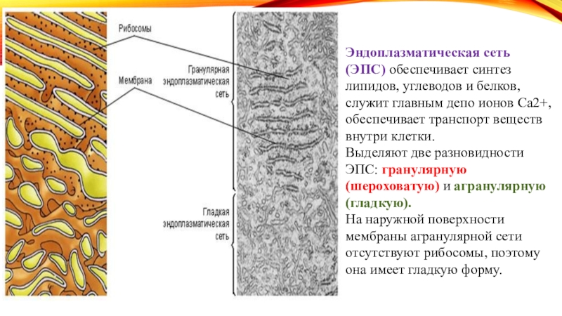 Слайд 9Эндоплазматическая сеть (ЭПС) обеспечивает синтез липидов, углеводов и белков, служит главным