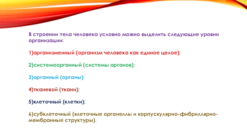 Слайд 3В строении тела человека условно можно выделить следующие уровни организации: