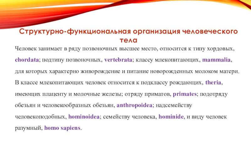 к типу хордовых, chordata; подтипу позвоночных, vertebrata; классу млекопитающих, mammalia, для которых характерно живорождение и питание новорожденных молоком матери. В классе млекопитающих человек относится к подклассу рождающих, theria, имеющих плаценту и молочные железы; отряду приматов, primates; подотряду обезьян и человекообразных обезьян, anthropoidea; надсемейству человекоподобных, hominoidea; семейству человека, hominide, и виду человек разумный, homo sapiens.