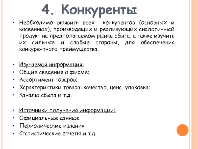Область деятельности фирмы, наличие и число конкурирующих фирм.