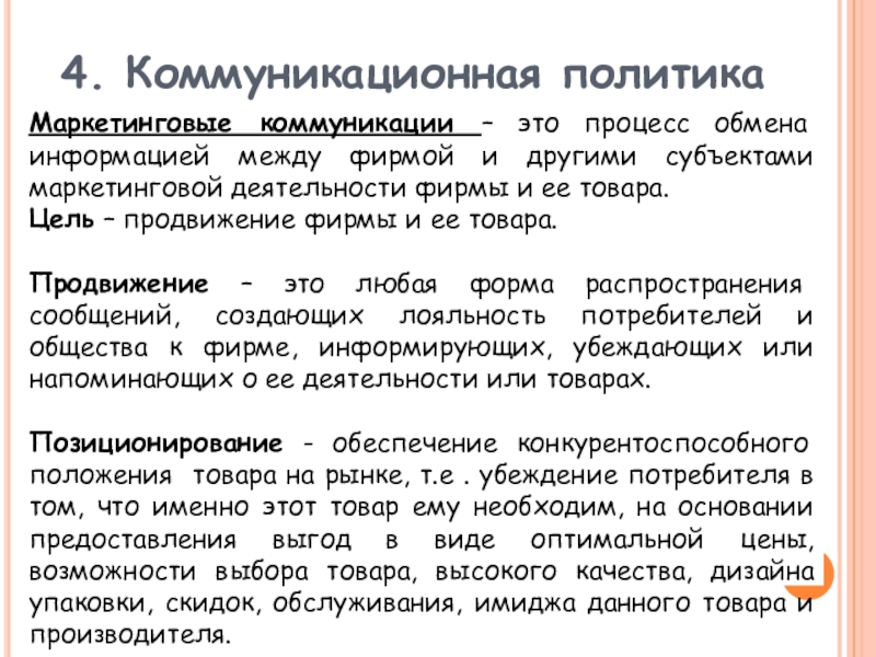 Позиционирование - обеспечение конкурентоспособного положения товара на рынке, т.е . убеждение потребителя в том, что именно этот товар ему необходим, на основании предоставления выгод в виде оптимальной цены, возможности выбора товара, высокого качества, дизайна упаковки, скидок, обслуживания, имиджа данного товара и производителя.