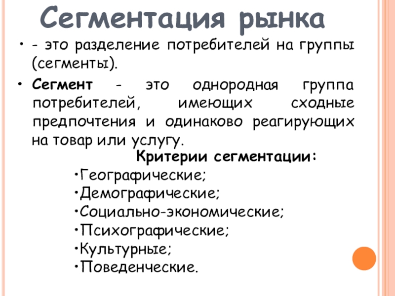 группа потребителей, имеющих сходные предпочтения и одинаково реагирующих на товар или услугу.