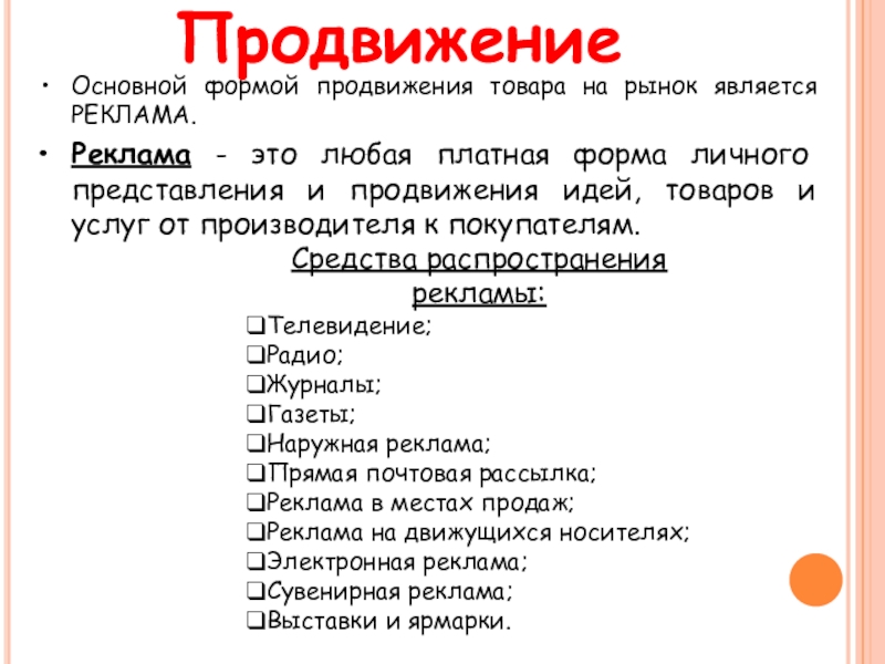 Продвижение – это любая форма распространения сообщений, создающих лояльность потребителей и общества к фирме, информирующих, убеждающих или напоминающих о ее деятельности или товарах.