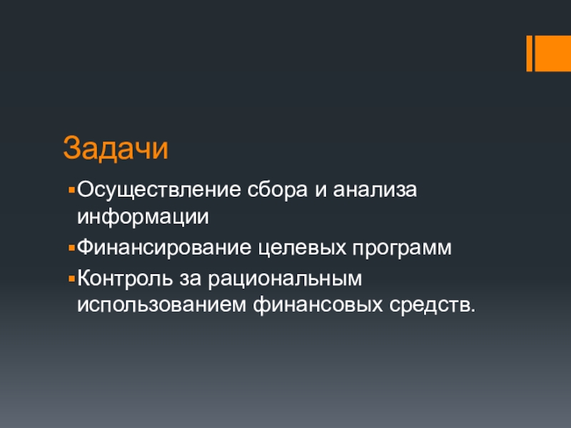 Задачи Осуществление сбора и анализа информацииФинансирование целевых программКонтроль за рациональным использованием финансовых средств.