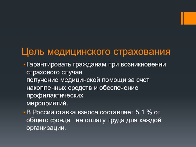 Цель медицинского страхованияГарантировать гражданам при возникновении страхового случая получение медицинской помощи за счет накопленных средств и обеспечение