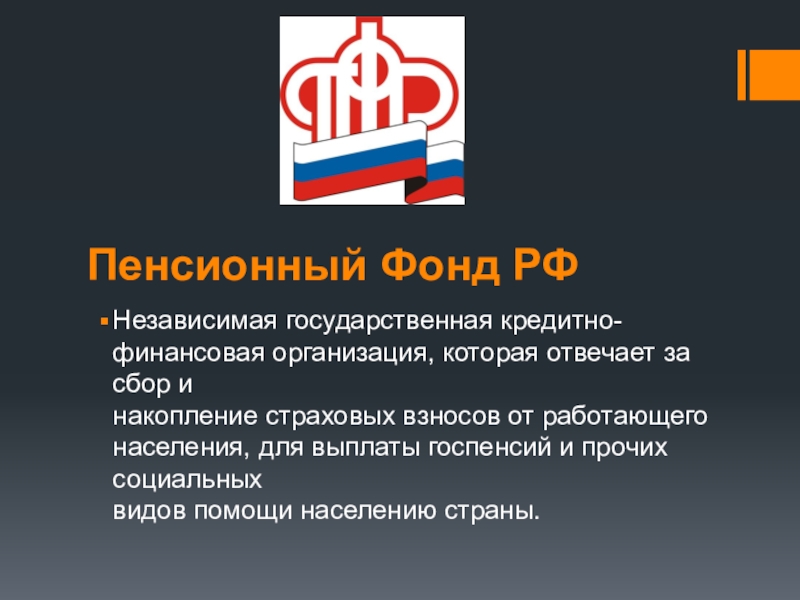 Пенсионный Фонд РФНезависимая государственная кредитно-финансовая организация, которая отвечает за сбор и накопление страховых взносов от работающего населения,