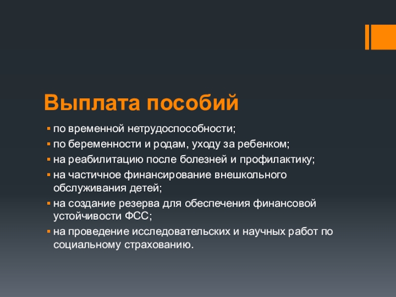 Выплата пособий по временной нетрудоспособности;по беременности и родам, уходу за ребенком;на реабилитацию после болезней и профилактику;на частичное