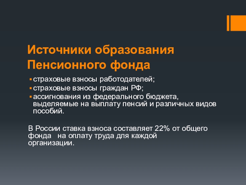 Источники образования Пенсионного фондастраховые взносы работодателей;страховые взносы граждан РФ;ассигнования из федерального бюджета, выделяемые на выплату пенсий и