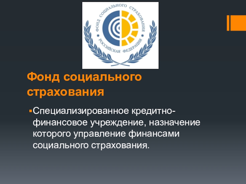 Фонд социального страхования Специализированное кредитно-финансовое учреждение, назначение которого управление финансами социального страхования.
