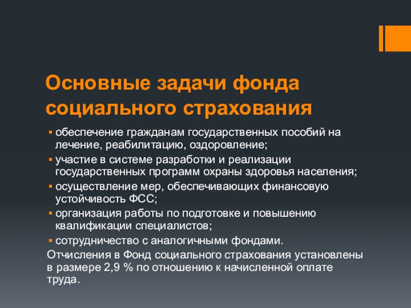Основные задачи фонда социального страхованияобеспечение гражданам государственных пособий на лечение, реабилитацию, оздоровление;участие в системе разработки и реализации