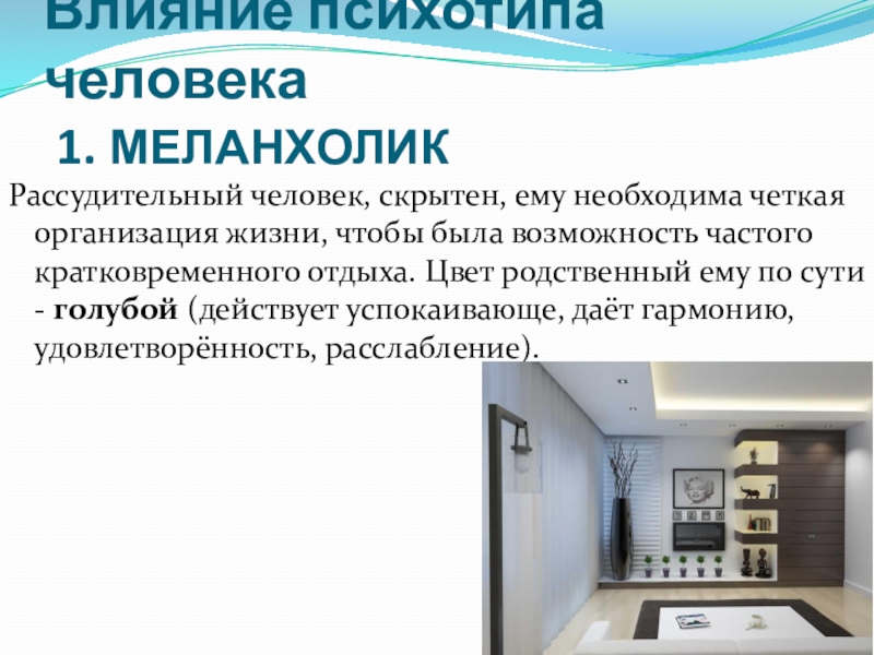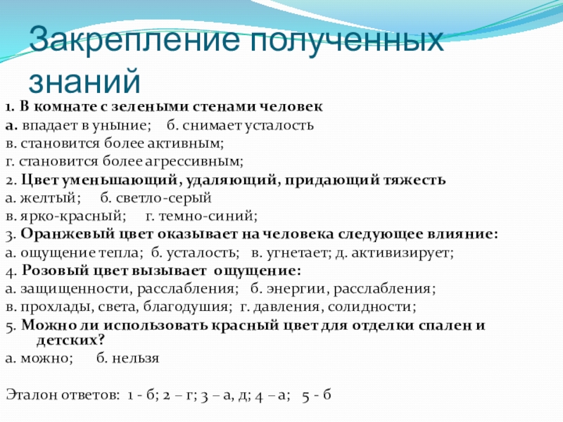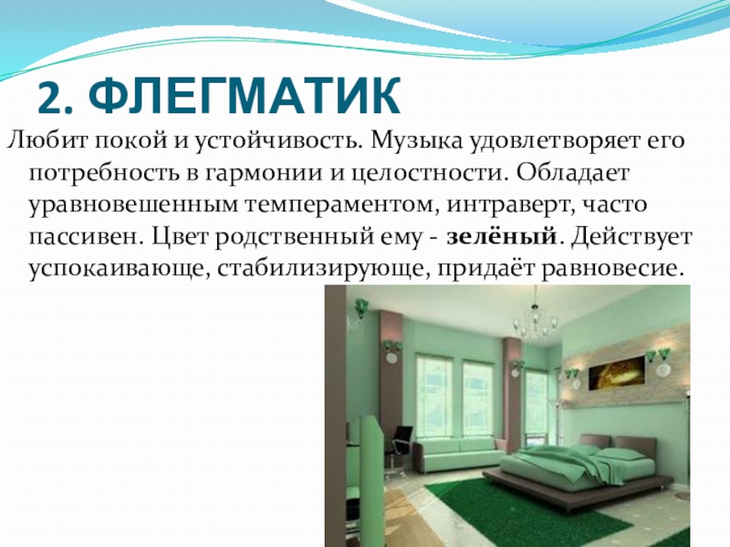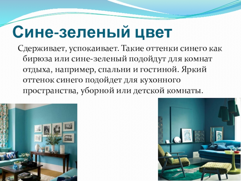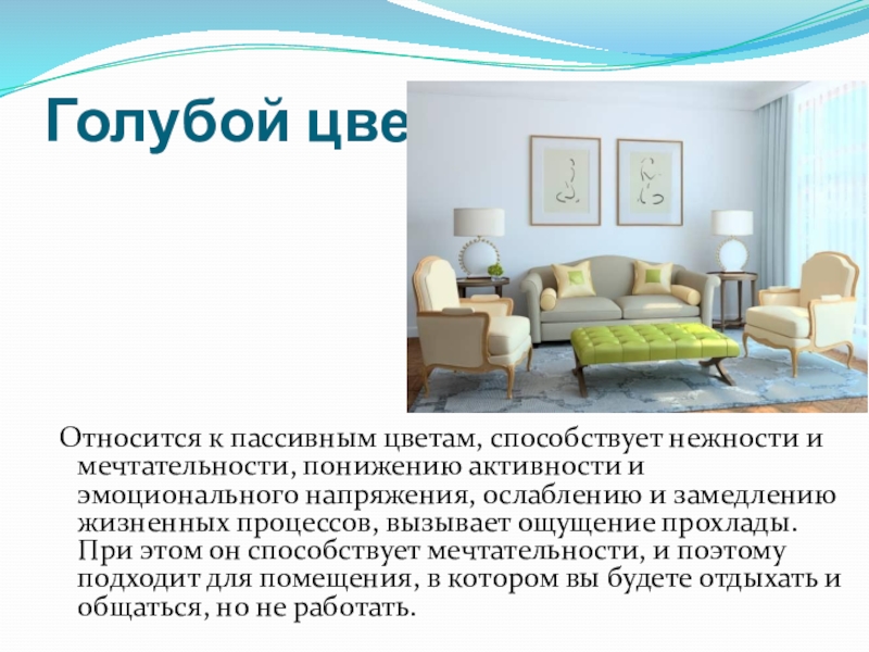 и эмоционального напряжения, ослаблению и замедлению жизненных процессов, вызывает ощущение прохлады. При этом он способствует мечтательности, и поэтому подходит для помещения, в котором вы будете отдыхать и общаться, но не работать.
