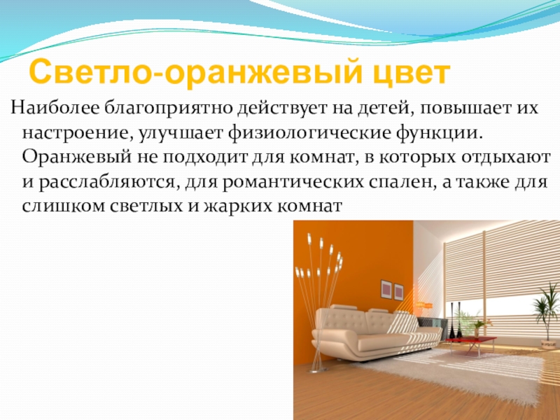 функции.Оранжевый не подходит для комнат, в которых отдыхают и расслабляются, для романтических спален, а также для слишком светлых и жарких комнат
