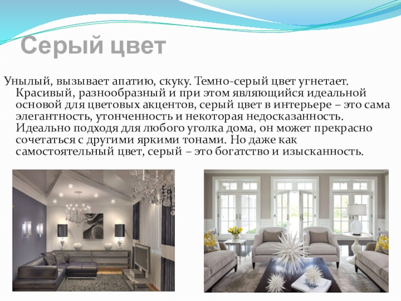 при этом являющийся идеальной основой для цветовых акцентов, серый цвет в интерьере – это сама элегантность, утонченность и некоторая недосказанность. Идеально подходя для любого уголка дома, он может прекрасно сочетаться с другими яркими тонами. Но даже как самостоятельный цвет, серый – это богатство и изысканность.