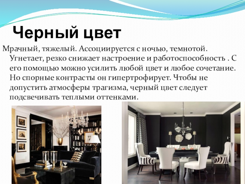 и работоспособность . С его помощью можно усилить любой цвет и любое сочетание. Но спорные контрасты он гипертрофирует. Чтобы не допустить атмосферы трагизма, черный цвет следует подсвечивать теплыми оттенками.