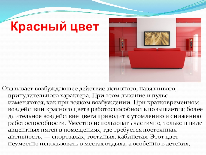 и пульс изменяются, как при всяком возбуждении. При кратковременном воздействии красного цвета работоспособность повышается; более длительное воздействие цвета приводит к утомлению и снижению работоспособности. Уместно использовать частично, только в виде акцентных пятен в помещениях, где требуется постоянная активность, — спортзалах, гостиных, кабинетах. Этот цвет неуместно использовать в местах отдыха, а особенно в детских.