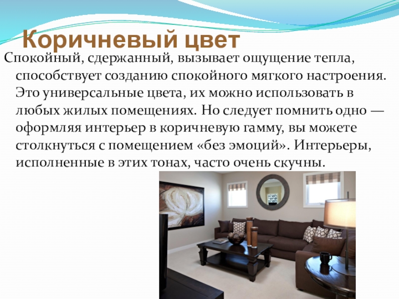 Это универсальные цвета, их можно использовать в любых жилых помещениях. Но следует помнить одно — оформляя интерьер в коричневую гамму, вы можете столкнуться с помещением «без эмоций». Интерьеры, исполненные в этих тонах, часто очень скучны.