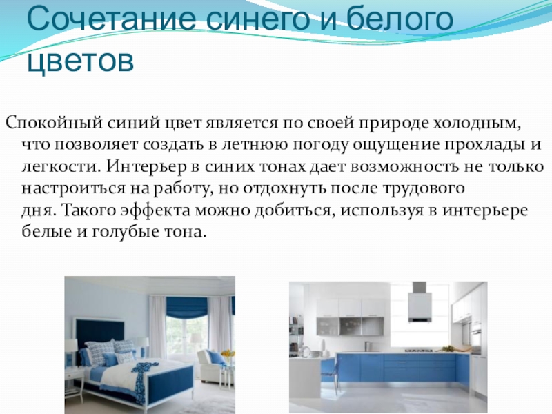 холодным, что позволяет создать в летнюю погоду ощущение прохлады и легкости. Интерьер в синих тонах дает возможность не только настроиться на работу, но отдохнуть после трудового дня. Такого эффекта можно добиться, используя в интерьере белые и голубые тона.