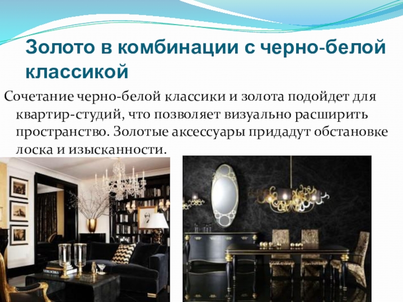для квартир-студий, что позволяет визуально расширить пространство. Золотые аксессуары придадут обстановке лоска и изысканности.